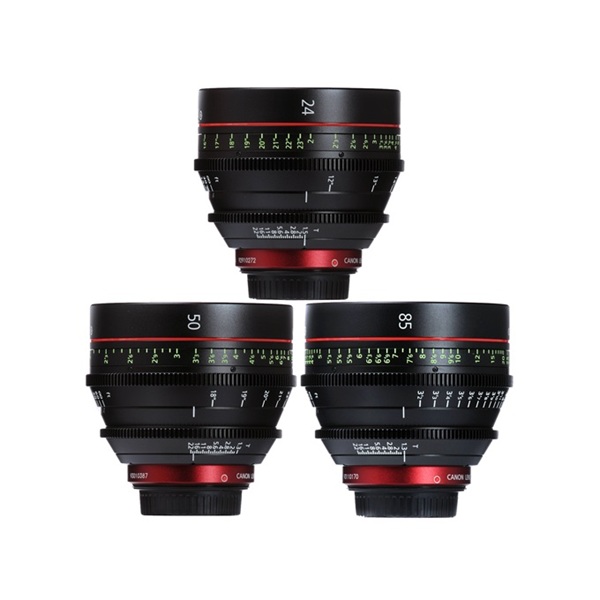 Набор светосильный праймов Canon из линейки объективов CN-E с фиксированными фокусными расстояниямя 24мм, 50мм и 85мм обеспечивает качество изображения 4K, контроль над фокусировкой и глубиной резкости благодаря стандартному ручному управлению. Диафрагма имеет одиннадцать лепестков и позволяет создавать эффектное размытие фона вне области объекта фокусировки. Асферические линзы в оптической схеме отвечают за резкость и точность. Узнаваемая конструкция модели компенсирует расширение и сужение корпуса при смене температуры, что позволяет избежать связанных с этим неполадок. Контакты на байонете поддерживают связь с камерой для записи метаданных и выполнения других функций.
