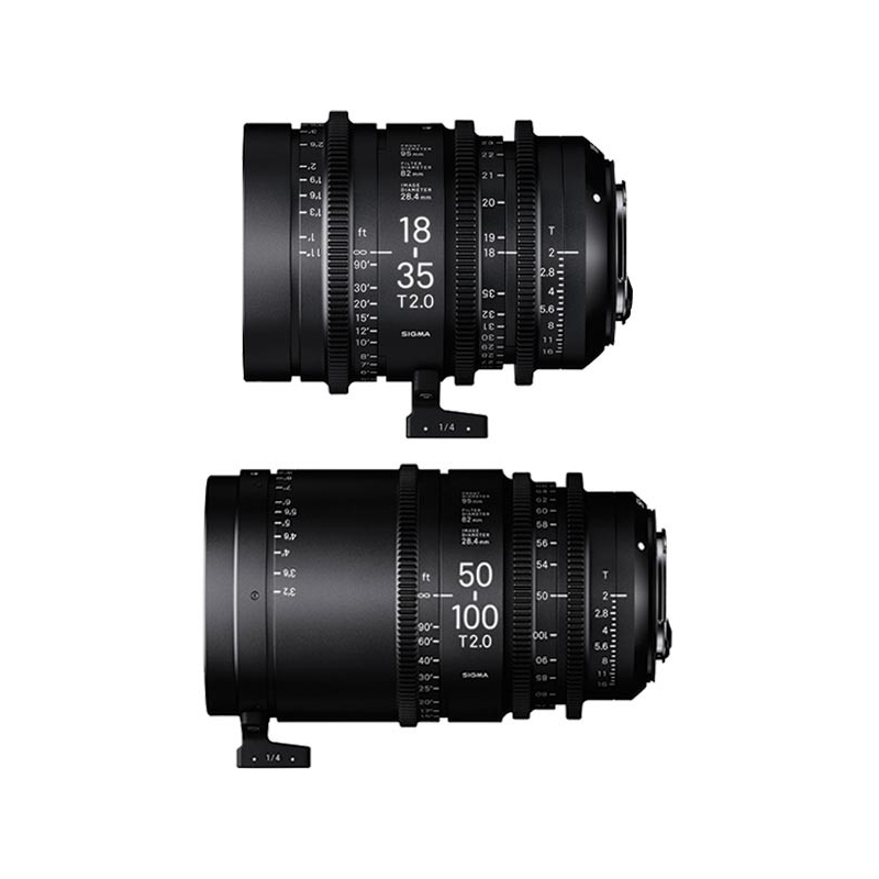 В комплект входят два профессиональных кинематографических зума с байонетом EF‑Mount: Sigma 50–100 мм T2 и Sigma 18–35 мм T2. Эти объективы идеально подходят для съёмок при слабом освещении благодаря ряду ключевых характеристик: постоянной светосиле T2 на всём диапазоне фокусных расстояний, совместимости с матрицами формата Super 35.